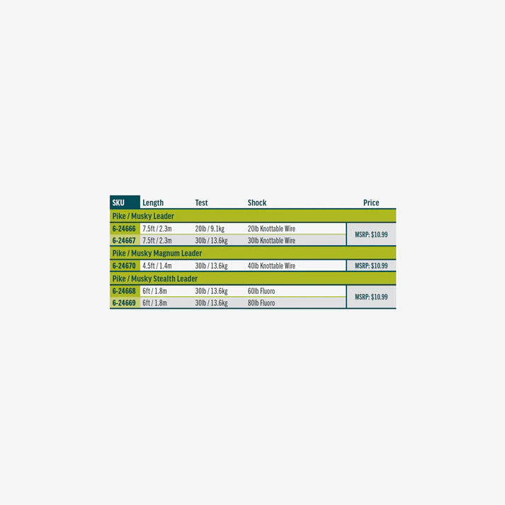 The Pike & Musky leaders are an ultra-stiff nylon leader attached to a tough, bite resistant knottable wire shock tippet or stealthy fluoro configuration that is ideal for Pike, Musky and similar toothy species.