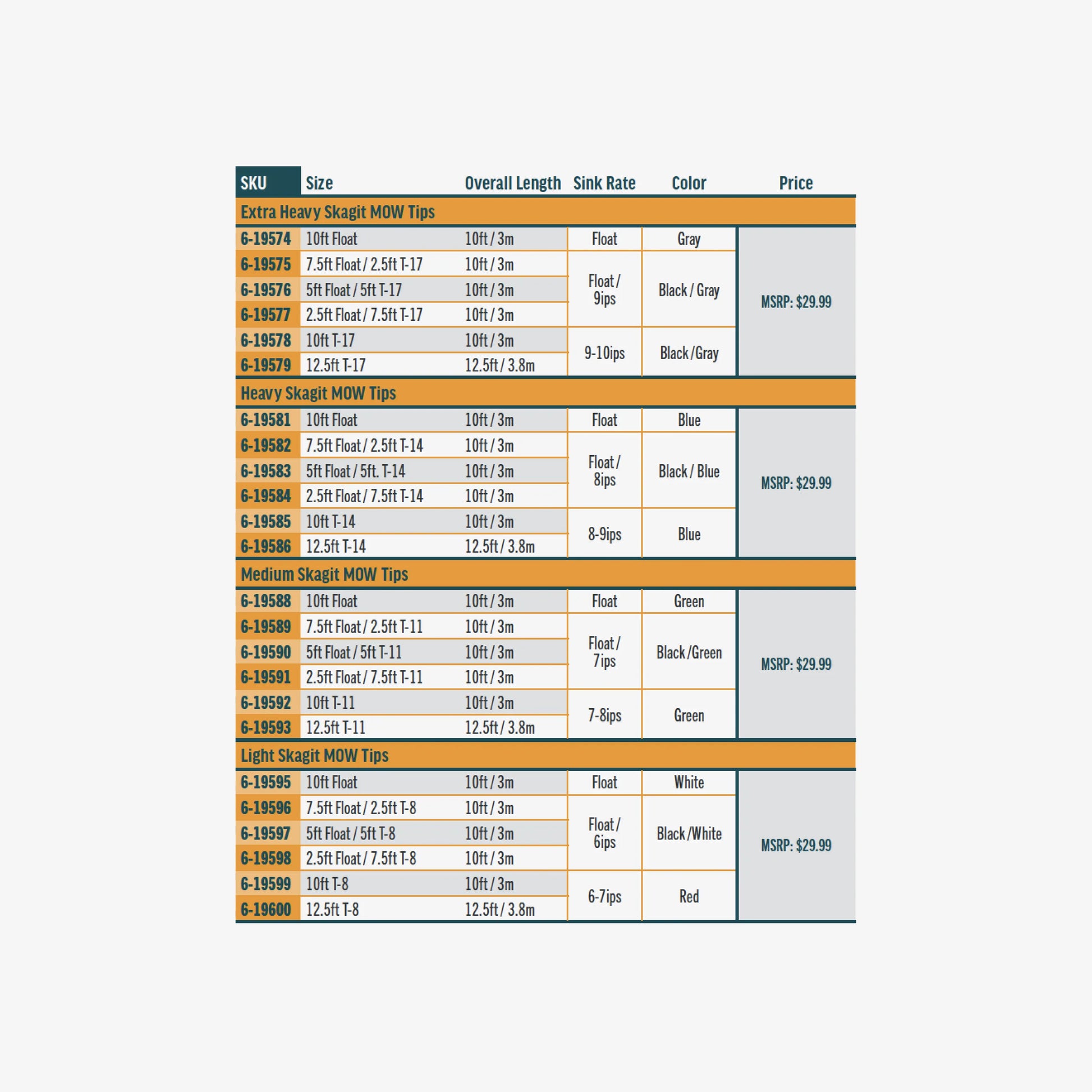The Medium MOW Tips feature T-11, with a sink rate of 8" per second, for the sinking material. Each of these tips has either a light green floating section or a green sleeve on one end for easy identification. The Medium MOW Tips are designed for heavily weighted flies and are ideal for Skagit lines between 475 and 575 grains. There are six unique tips that make up the series.